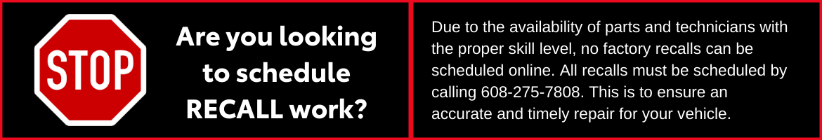 Due to limited availability of recall parts you must call to schedule any recall service needed. Typically all recall parts are ordered on a case by case basis and your vehicle identification number (VIN) will be needed to order the necessary parts. Any appointments made without following these steps will result in an unnecessary trip to the dealership and rescheduling the appointment for when parts become available. We apologize for any inconvenience this may cause.